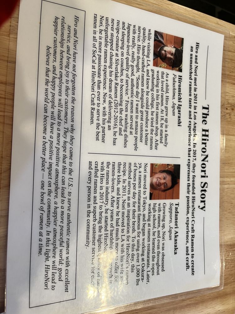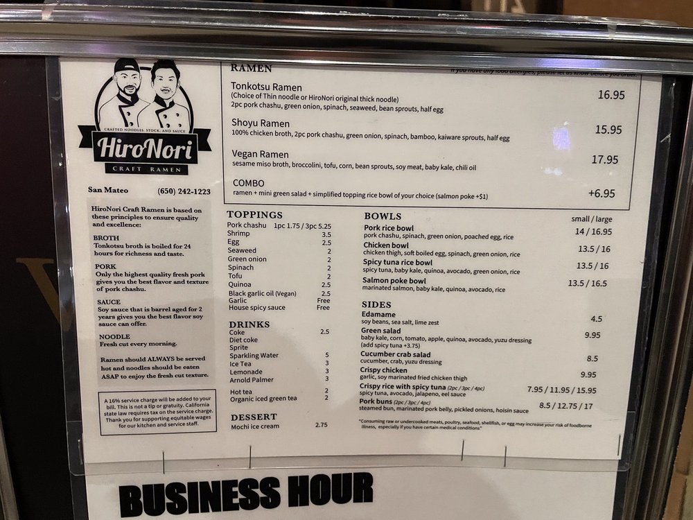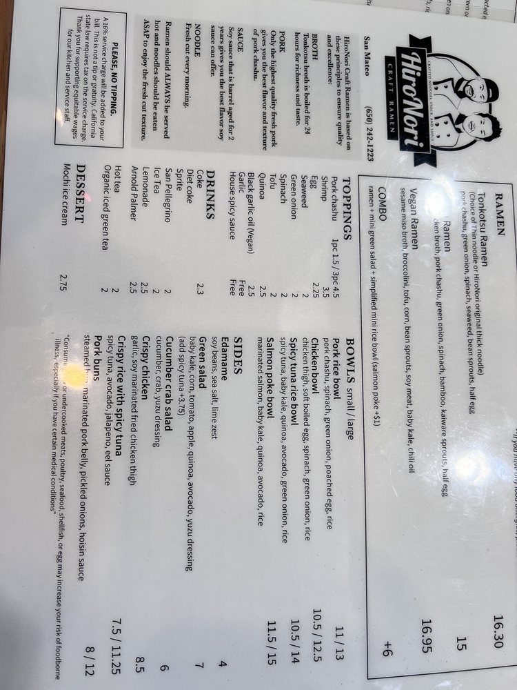 Welcome to HiroNori Craft Ramen in San Mateo, a haven for ramen enthusiasts located at 211 E 3rd Ave. The menu showcases a delightful variety of ramen dishes designed to satisfy every palate. Highlights include the rich Tonkotsu Ramen, featuring your choice of thin or thick noodles, paired with tender pork chashu, vibrant greens, and a perfectly soft-boiled egg. For a lighter option, the Shoyu Ramen offers a flavorful chicken broth alternative.
